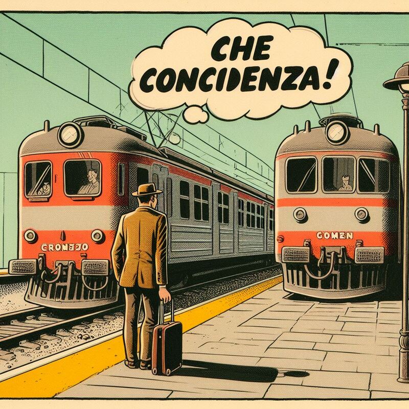 Gek genoeg heet in het openbaar vervoer een aansluiting ook een coincidenza, dat dan neutraal het samenkomen van 2 verschillende lijnen betekent. Maar door de reputatie van de Italiaanse staatsvervoerbedrijven lukt het je natuurlijk niet om de verwijzing naar de toevalligheid van je af te schudden. „Wat een toeval: ik kan meteen overstappen, de aansluiting staat klaar. Dat gebeurt anders nooit!”