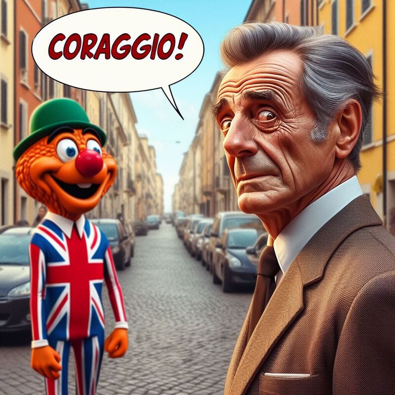 Coraggio betekent letterlijk moed, maar kan ook sarcastisch bedoeld zijn, zoals in het bovenstaande voorbeeld: ’Veel succes!’ Ook de wens auguri kan zo gebruikt worden: ’Gefeliciteerd!’ (maar niet heus).