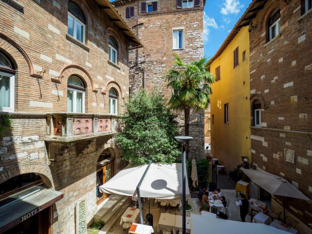Klassiek Italiaans meubilair, kroonluchters en plafondschilderingen: je vindt het er allemaal. Dit hotel bevindt zich midden in het historische centrum van Perugia, direct naast de centrale bushalte.