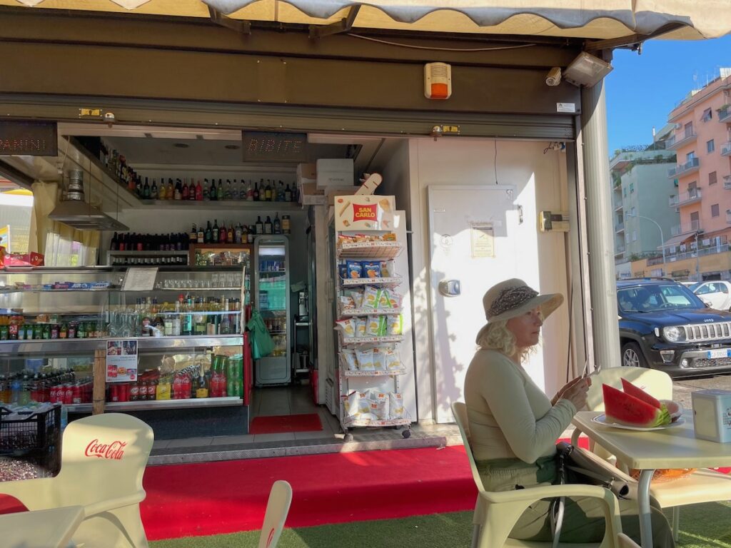 Nog gemakkelijker is om een schijf te kopen bij de cocomeraro, de straatverkoper. Bij mij in de buurt, tegenover de PAM-supermarkt en vlak bij de bushalte, is zo’n uitspanning. Je kunt er kersen, perziken en meloenen kopen, evenals de kant en de klare mix macedonia, en een vers afgesneden schijf eten aan een plastic tafeltje. Bord en bestek krijg je erbij en dat alles voor maar ƩƩn euro.