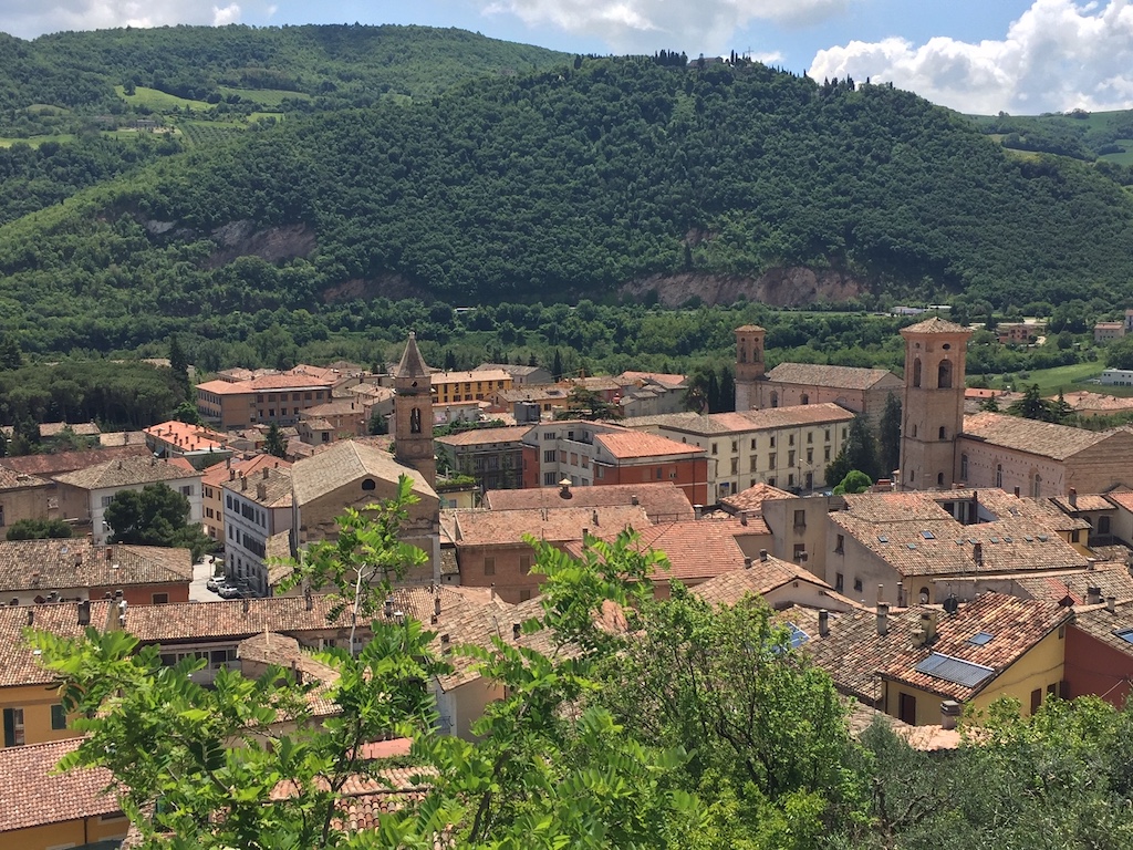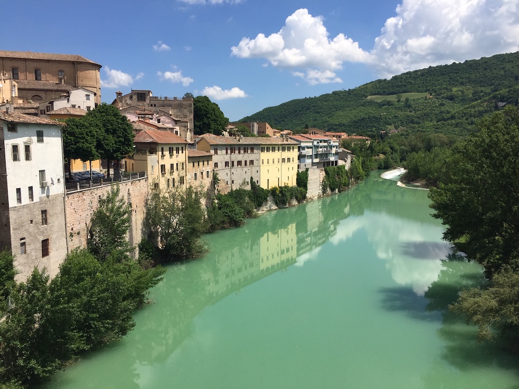 Als je zo’n wijnreisje maakt, raak je nog wel eens verzeild op plekken waar je anders nooit zou komen. Ditmaal was dat Fossombrone, een middeleeuws tegen de helling aangebouwd stadje, prachtig gelegen aan de helgroene rivier Metauro. De centrale Via Garibaldi is geflankeerd door antieke, zij het niet altijd even goed onderhouden, zomerpaleizen van renaissancefamilies als Malatesta en Della Rovere.
