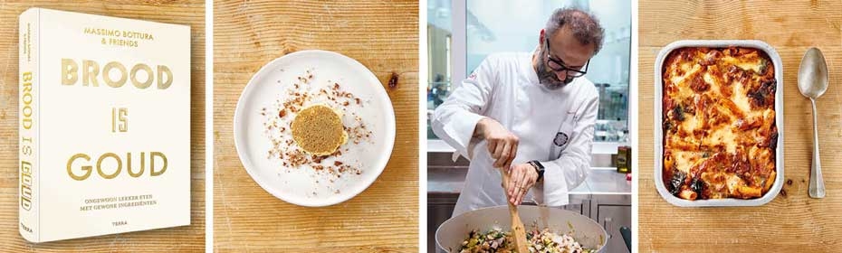 Massimo Bottura is een Italiaanse topkok. Twee jaar geleden verscheen in Nederland een dik kookboek van de kok, waarin ik met hem kennis maakte. Een fenomeen, die Bottura. In Italië heeft hij zijn eigen sterrenrestaurant in Modena: Osteria Francescana, dat afgelopen dinsdag opnieuw tot beste restaurant ter wereld werd uitgeroepen. Hij heeft ook een nieuw kookboek waarin hij je leert hoe je ‘ongewoon lekker kunt eten met de gewoonste ingrediënten’: Brood is goud.