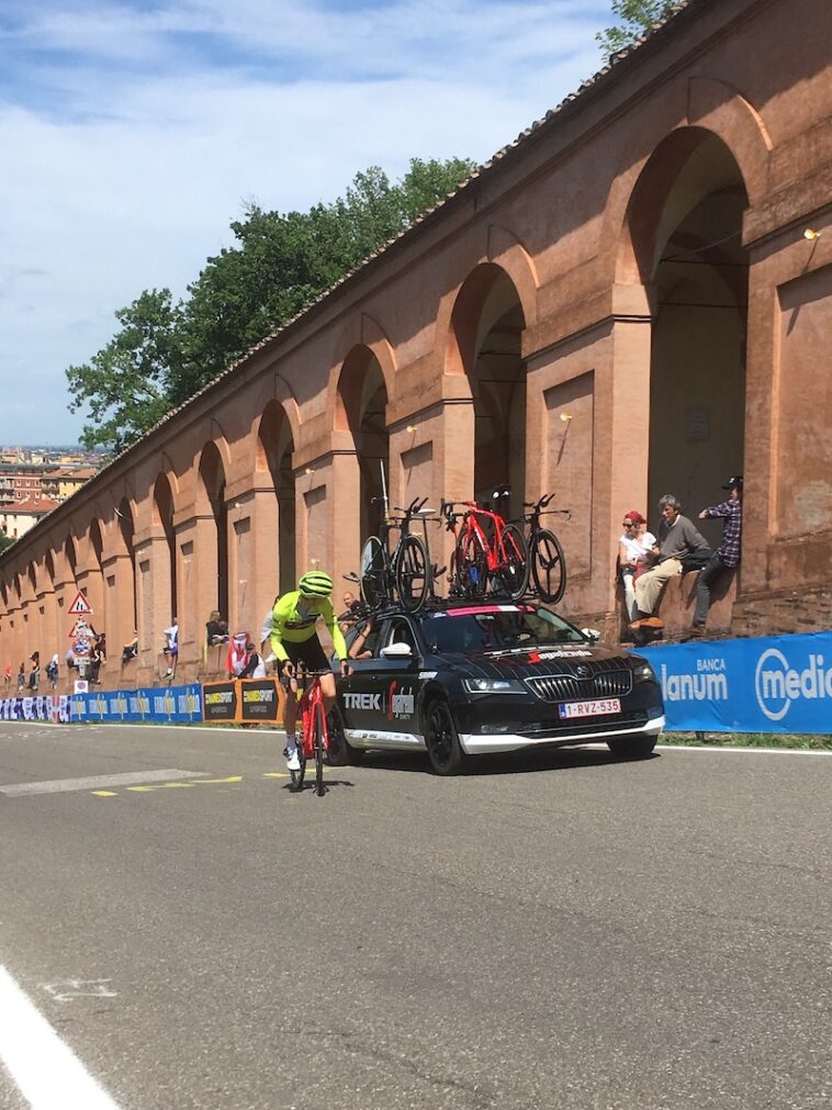 Na twee kilometer duikt de Arco del Meloncello op: de roodoranje boog met zuilen en hoge ramen die over de weg loopt en het begin van de klim naar de basiliek van San Luca markeert. We zijn niet de enige die de renners tijdens deze spectaculaire klim willen toejuichen. Bologna loopt massaal uit om te zien hoe Tom Dumoulin, Simon Yates en Primoz Roglic de steile heuvel – stijgingspercentages van 16% – gaan bedwingen…