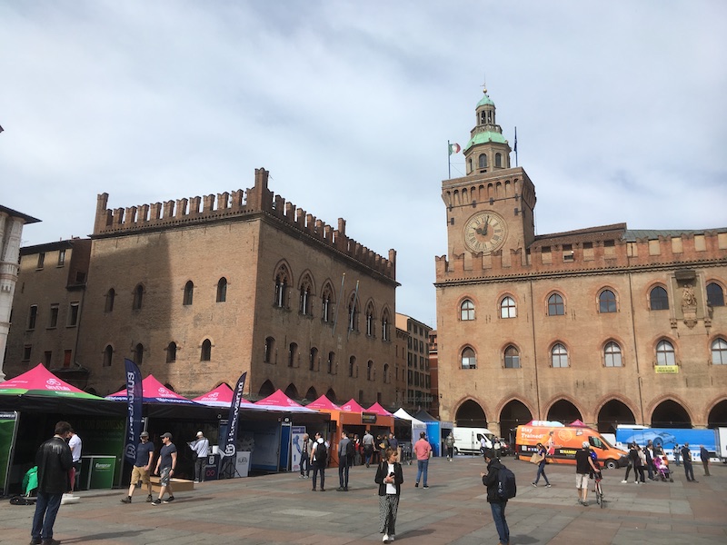Alleen de blauwe vrachtwagen van Shimano en de roze partytenten bevestigen dat we aan de vooravond van La Grande Partenza staan. Morgen vliegen de renners hier – in de schaduw van de scheve Toren van Asinelli en de nog schevere Toren van Garisenda – één voor één van het startpodium voor de eerste etappe van de Giro d’Italia 2019: een individuele tijdrit van 8,2 kilometer die eindigt met een spectaculaire klim. Boven wacht de basiliek van San Luca. En wij…