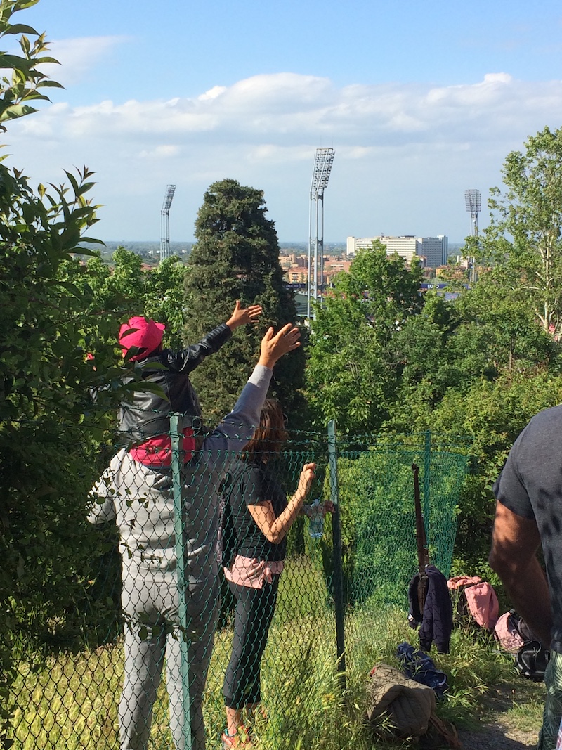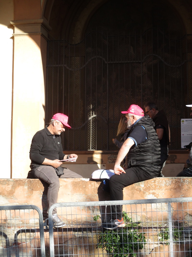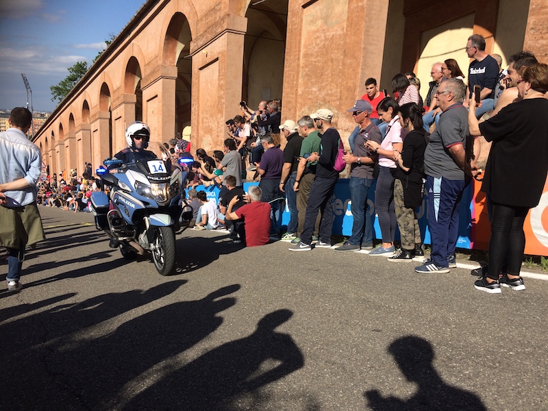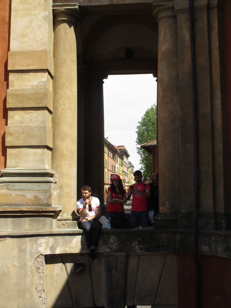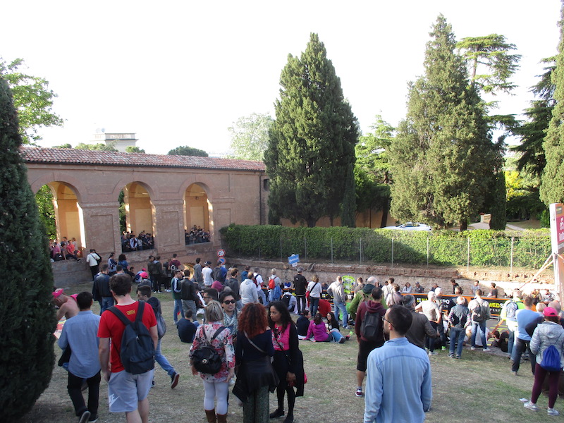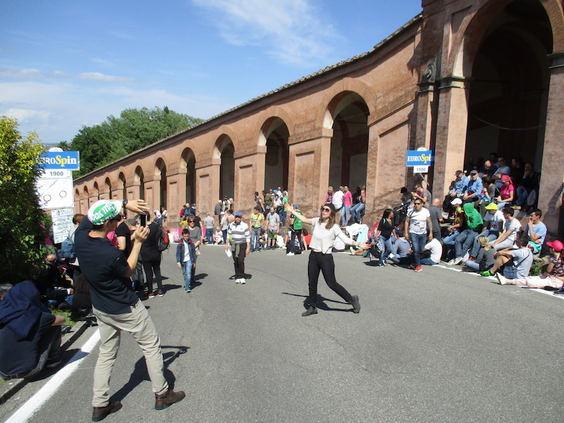 Na 600 meter stoppen we voor een bocht. Beter zicht op de renners gaan we niet krijgen. De hoge cipressen aan de zijkant bieden beschutting tegen de warme zon en even kijken we genietend om ons heen: de blauwe lucht steekt fel af tegen de lange rode portico en de groene heuvels van de Apennijnen. Maar de steeds smaller wordende weg en het spektakel eromheen trekken al snel onze aandacht. Op alle muurtjes van de portico zitten families, studenten en vriendengroepen.