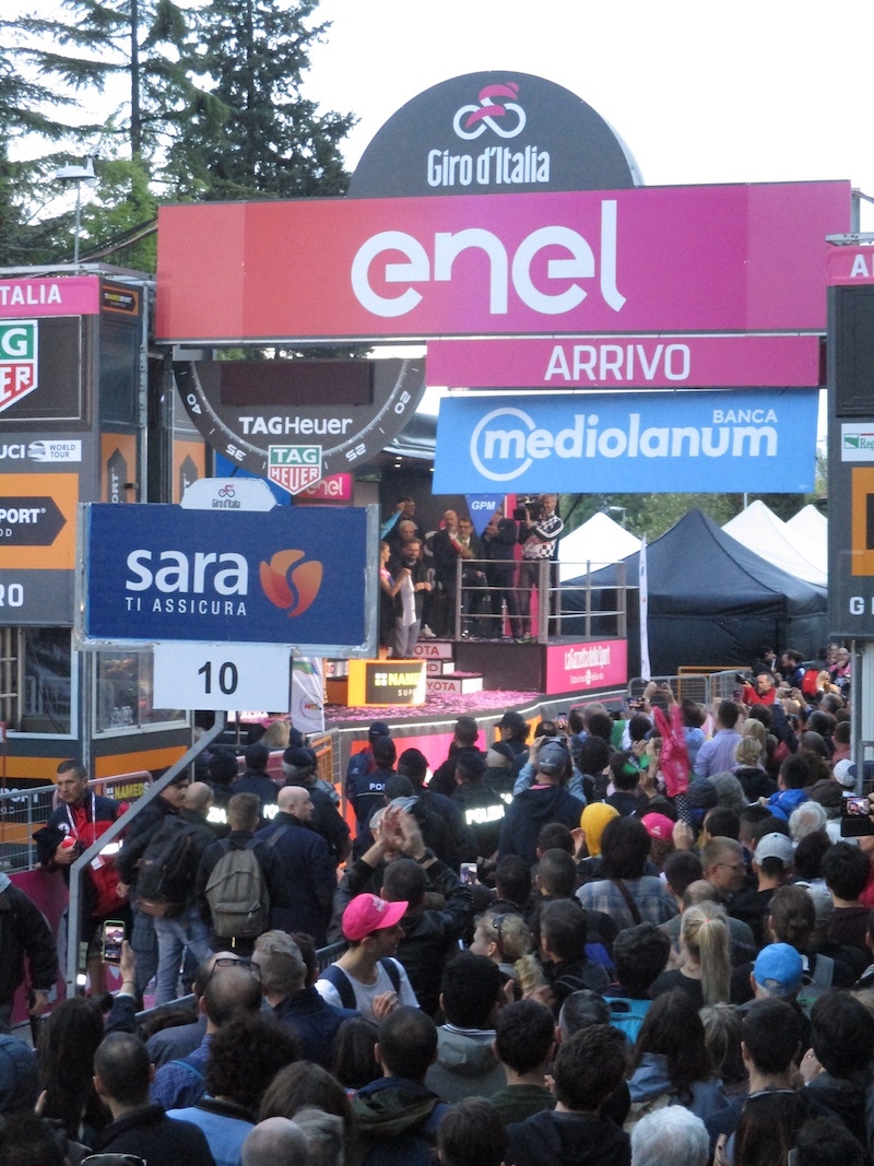 Dat vinden we een paar honderd meter voorbij de basiliek, die van dichtbij met haar torens, verlichte zuilengalerijen en grote koepel nog indrukwekkender is dan hij vanuit het centrum lijkt. We worden door Italiaanse fans op een hoge muur getrokken, vanwaar we het podium goed zien. Daar ontvangt Primoz Roglic van de rondemissen de roze trui. Met zijn 12 minuten en 54 seconden heeft de Sloveen de 8,2 kilometer van Piazza Maggiore naar San Luca het snelste afgelegd.