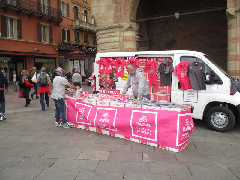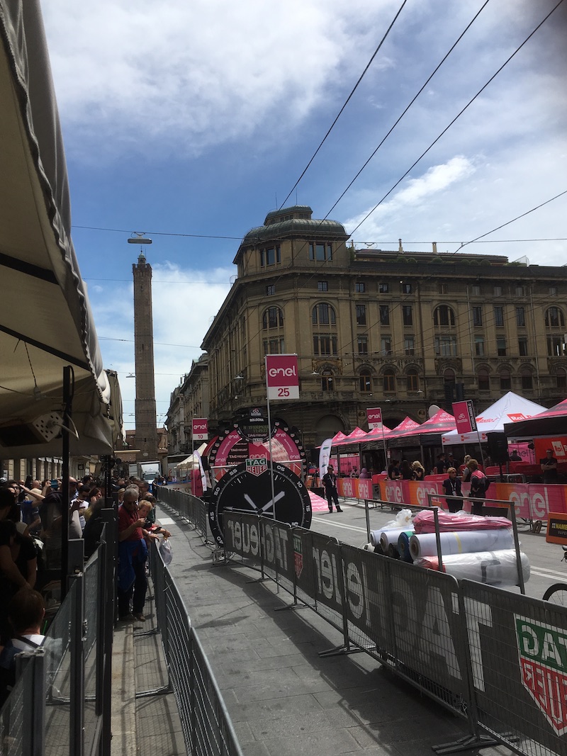 De volgende ochtend blijkt dat Piazza Maggiore gedurende de nacht een metamorfose heeft ondergaan: Het verhoogde deel in het midden van het plein staat vol roze stands met promotiemateriaal en merchandising en honderden dranghekken. De Italianen zelf zijn echter stijlvol als altijd. Hier geen pruiken, leeuwenpakken of oranje jurkjes. Een roze pet kan net. Dat weerhoudt hen er echter niet van om massaal naar Piazza Maggiore en de naastgelegen Via Rizzoli te komen, waar vannacht het startpodium en viptribunes zijn verrezen.