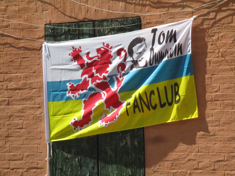 De helikopter van de Italiaanse publieke omroep cirkelt onophoudelijk boven ons. Maar het geschreeuw en gejuich van de Italianen op de steile weg overstemt het geklapper van de wieken. Camera’s flitsen en mobiele telefoons vechten om voorrang. Want daar komt Tom Dumoulin…