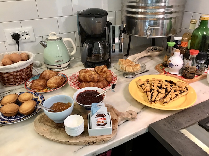 ’s Avonds om 22.00 uur stonden we nog vers fruitsap te persen en ’s ochtends om 07.00 uur (niet te vroeg pieken) toverden we de woonkamer om tot een ware ontbijtzaal met pasticiotti, croissantjes en allerhande zoetigheden.