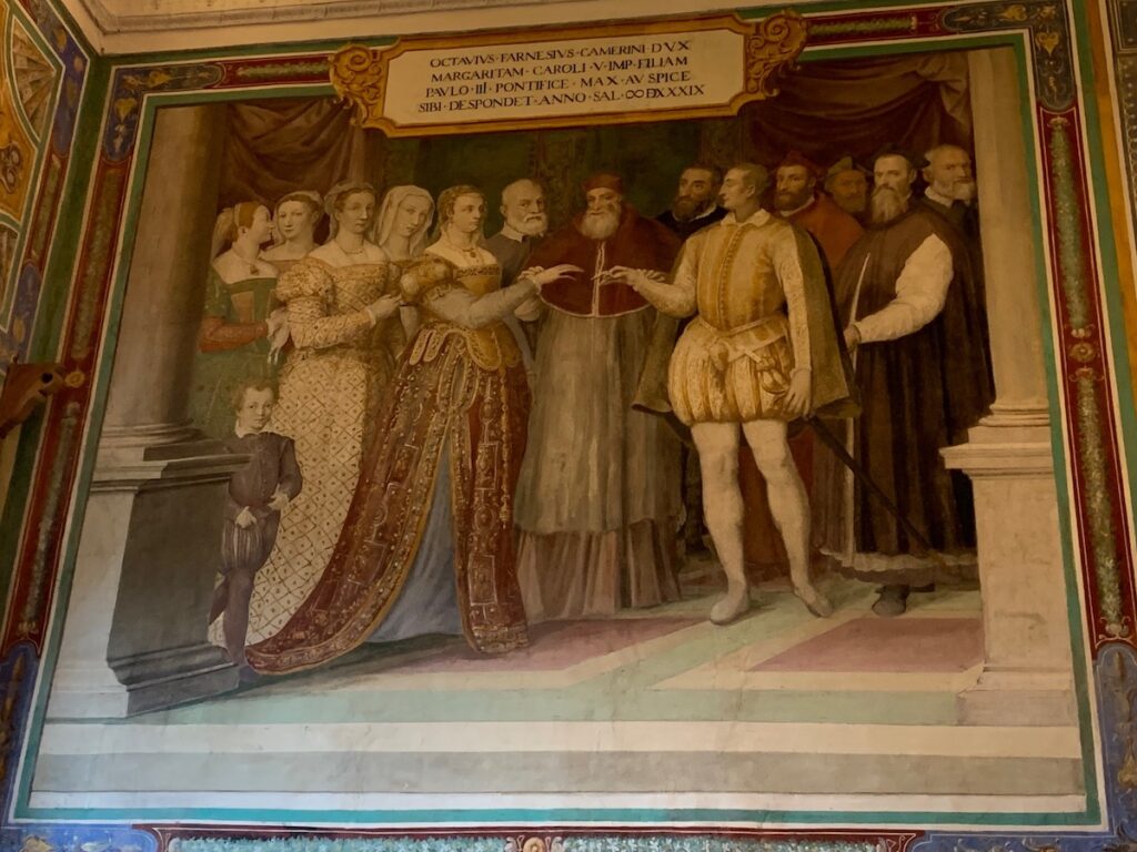 Intussen hadden we ook een tour door het Palazzo gemaakt en daarbij onze ogen uitgekeken. Het vijfhoekige Palazzo Farnese in Caprarola is tussen 1559-75 gebouwd als lustoord in opdracht van een kardinaal Farnese die ook alweer Alessandro heette, neef (oomzegger) van de paus en oudoom van onze landvoogd.