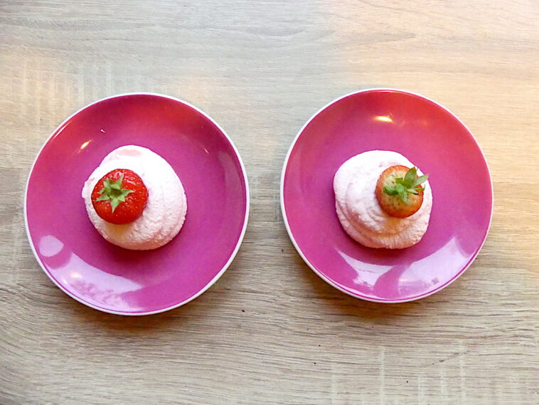 Aardbeienborsten. Een roze bord met twee rechtopstaande vrouwenborsten van ricotta, roze gekleurd met campari en met geconfijte aardbeien als tepels. Doordat er zich onder de ricotta nog meer verse aardbeien bevinden, heeft men het gevoel in een ideale aanwas van denkbeeldige borsten te bijten.
