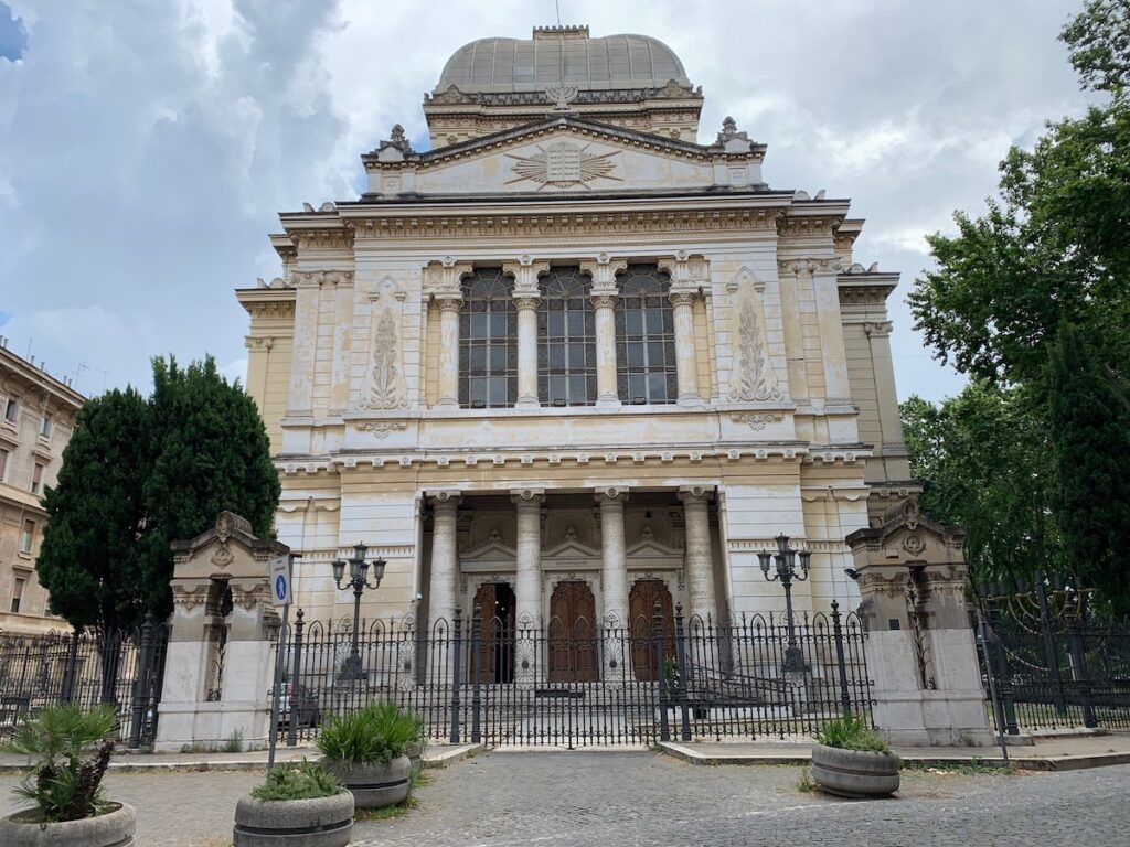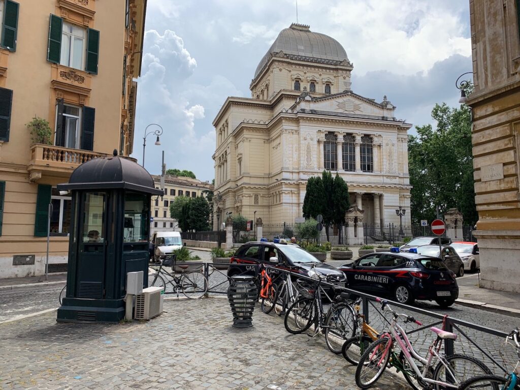 Aan de overkant ligt het gebouw van de joodse scholengemeenschap, niet de enige maar wel de grootste Israëlitische onderwijsinstelling van Rome. Aan de muur hangen de vlaggen van Italië, EU en Israël en bij het uitgaan van de school houden carabinieri en burgers de wacht.