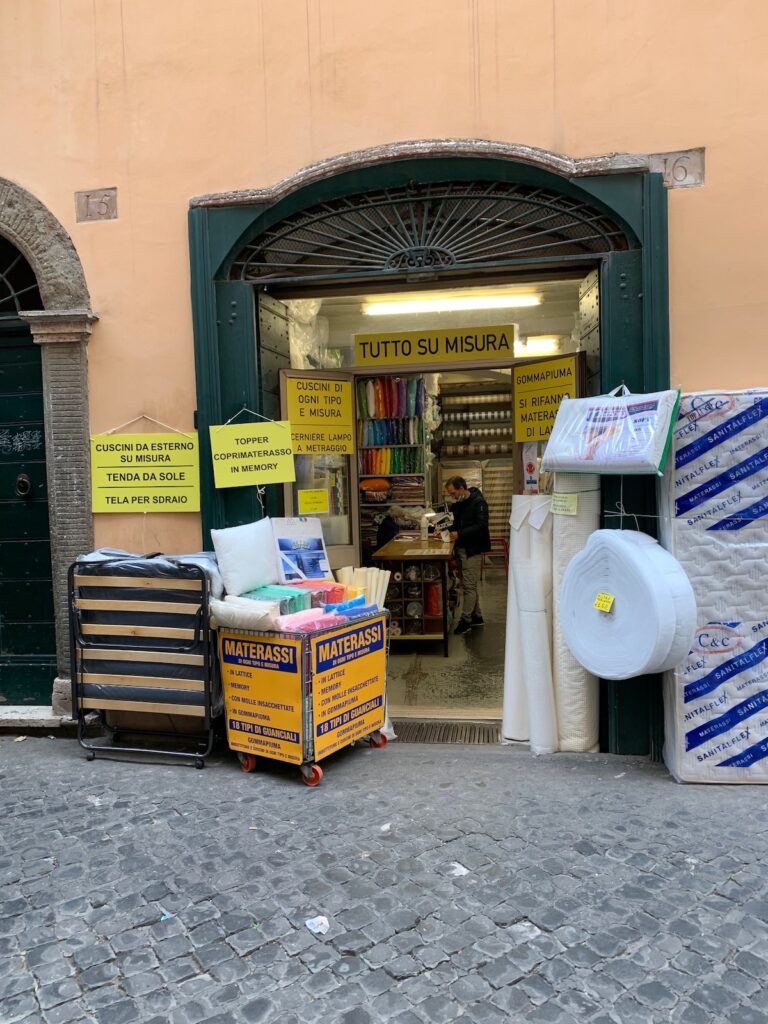 Voorbij de restaurants, waar de weg naar rechts buigt, kom je langs de etalage van een zaak die in Rome een begrip is: Leone Limentani, in huishoudelijke artikelen sinds 1820.