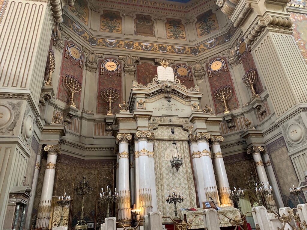 Er tegenover ligt de – ook door carabinieri bewaakte – synagoge die aan het begin van de vorige eeuw in de plaats kwam van de 5 eerdere joodse godshuizen die bij de sanering van 1882 waren gesloopt.