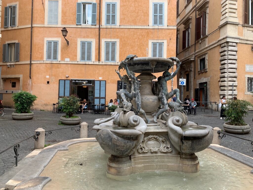 De weg komt uit op Piazza Mattei, met het gelijknamige Palazzo, waar ooit de familie huisde die de sleutels van de toegangspoorten tot het getto beheerde. Maar het plein is vooral bekend door de barokke Fontana delle Tartarughe, de vermaarde, bijna net zo vaak als de Trevifontein gefotografeerde, ‘Schildpaddenfontein’ met haar sierlijk drinkende reptieltjes.