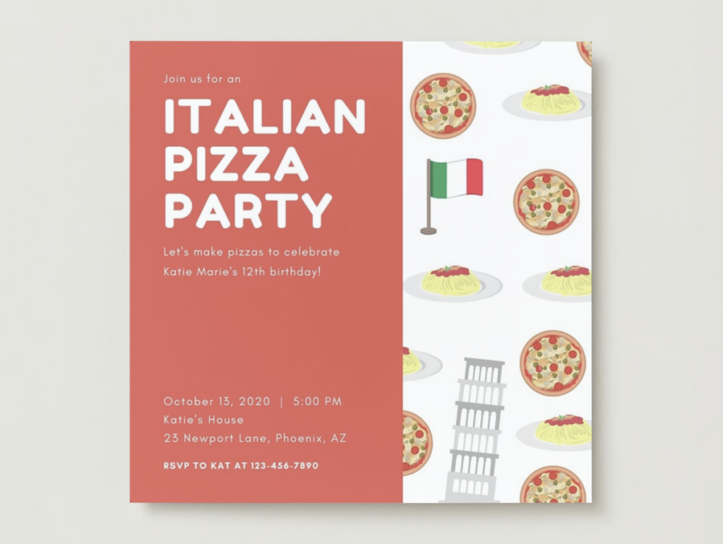 Maak je gasten meteen enthousiast voor je festa italiana met een uitnodiging in Italiaanse stijl. Gebruik kleuren zoals rood, wit en groen, en versier de uitnodiging met afbeeldingen van Vespa’s, wijnglazen, de Colosseum of een pizza.