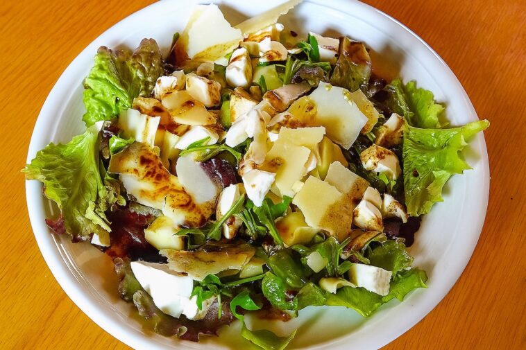 Drapeer de spinazieblaadjes op een bordje. Verdeel de artisjokken, tomaatjes, mozzarella en parmezaanse kaas hierover. Maak een dressing van olijfolie, balsamicoazijn en zout (ongeveer 5 lepels olie en 3 lepels balsamico).