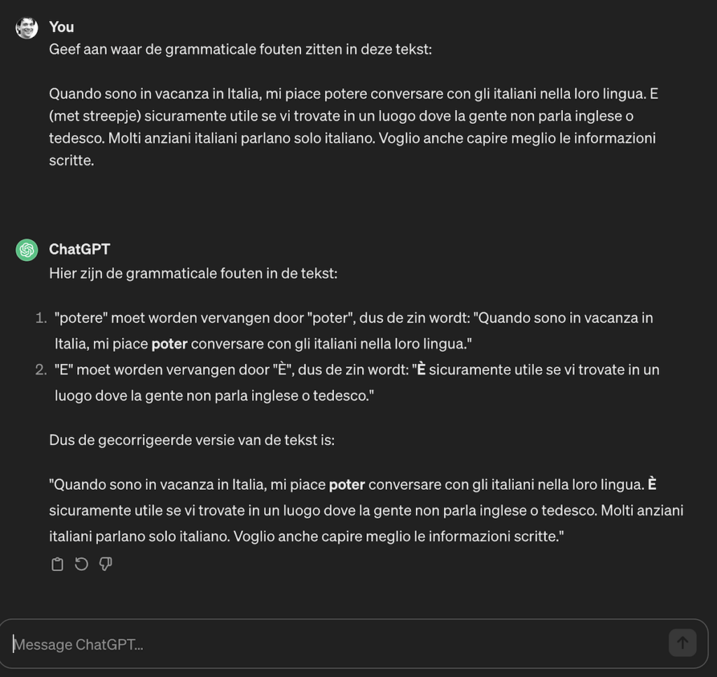 AI kan je zinnen corrigeren of vertalen en dat is natuurlijk een heel nuttige functie. Je kunt je opdrachten die je vanuit de cursus Italiaans hebt gekregen indienen en vragen om feedback. Zie het volgende voorbeeld met ChatGPT: