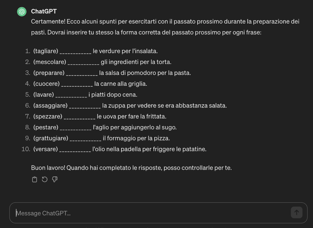 Bijvoorbeeld: kun je oefeningen maken voor me van de passato prossimo in het Italiaans die zich afspelen tijdens het koken? Er rolt dan bijvoorbeeld uit: