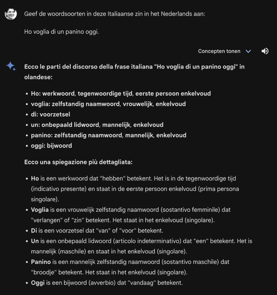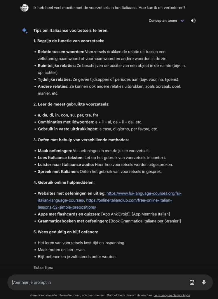 Je moet soms heel specifiek zijn in de opdrachten die je aan AI geeft en daardoor meer van het Italiaans weten dan je eigenlijk weet als student om goede vragen te kunnen stellen waar AI op kan antwoorden.