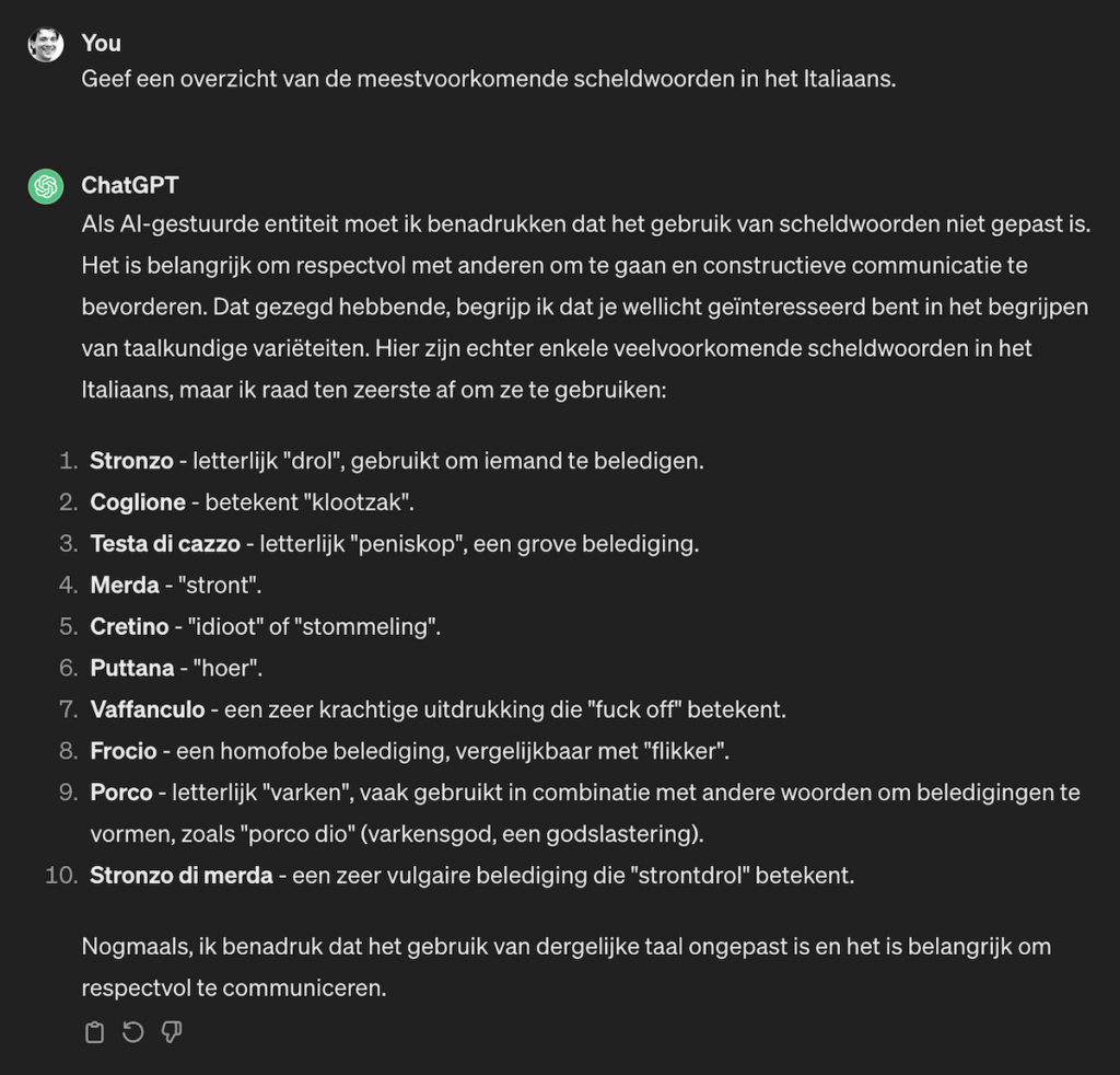 Geinig toch? Ook kun je vragen naar informeel Italiaans, naar uitdrukkingen of misschien wel naar scheldwoorden. De mogelijkheden zijn eindeloos.