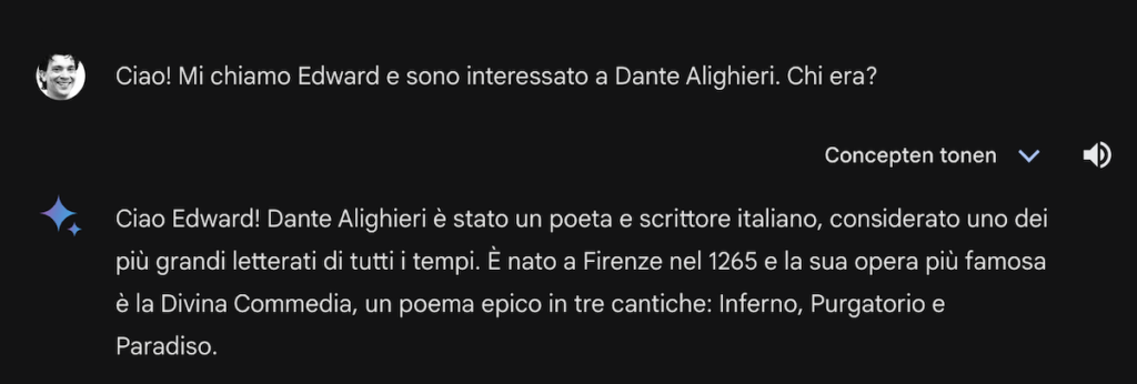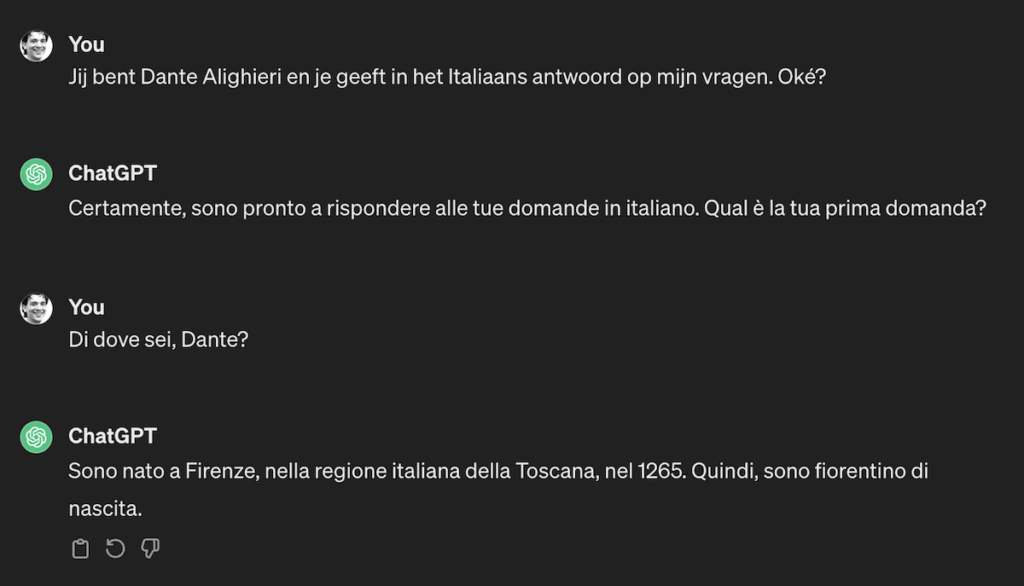 Je kunt AI vragen om een gesprek te voeren in het Italiaans met een willekeurig historisch/fictief cultureel of politiek personage. Je gaat dan bijvoorbeeld in het Italiaans een gesprek op niveau A2 oefenen met bijvoorbeeld Dante Alighieri. Je kunt vragen waar hij vandaan kwam, waarom hij zijn boeken heeft geschreven, wie zijn grote liefde was enzovoorts.