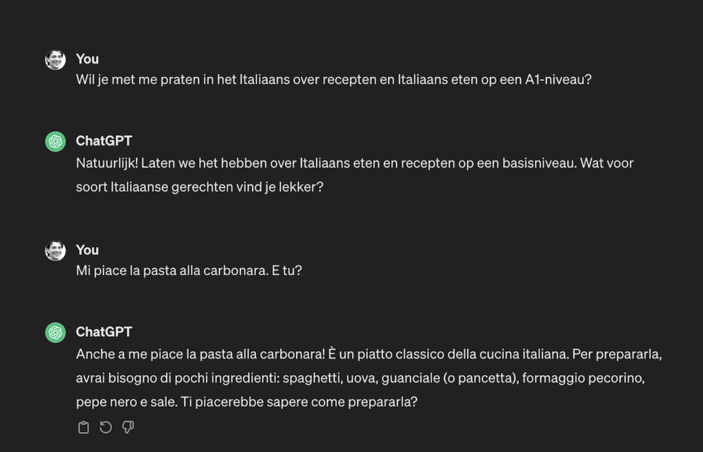 Je kunt AI ook vragen om gezellig kletsen over een onderwerp dat jij interessant vindt, op een bepaald niveau. Je kunt AI bijvoorbeeld vragen: ‘Wil je met me praten in het Italiaans over recepten en Italiaans eten op een A1-niveau?’
