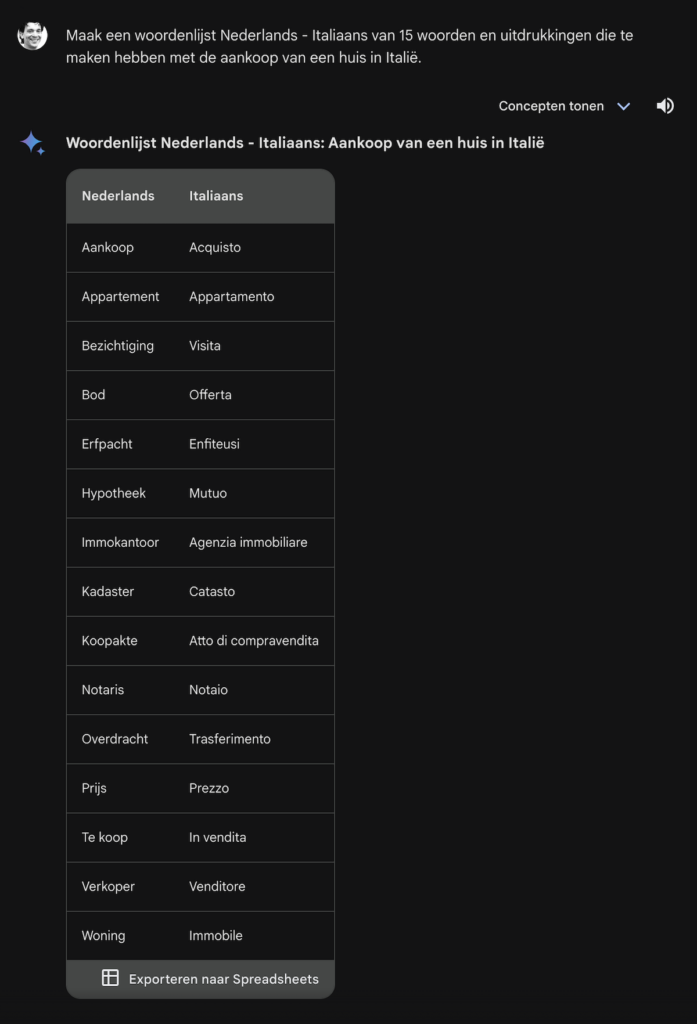 Je kunt AI vragen specifieke woordenlijsten Italiaans – Nederlands of Nederlands – Italiaans te maken over een bepaald onderwerp. Er zijn in de Community van Dit is Italiaans (de taalschool van Dit is Italië, zie hier voor meer informatie) veel mensen met een huis in Italië.