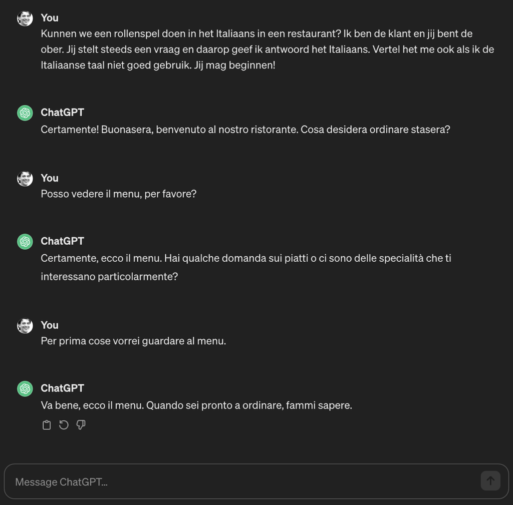 Bijvoorbeeld: ‘Kunnen we een rollenspel doen in het Italiaans? In een restaurant, niveau A2’. Dan kun je een heel leuk gesprekje voeren over bestellen in een restaurant. Je kunt zelf willekeurig wat voor rollenspel spelen. Je moet ChatGPT of Google Gemini wél vertellen wat je behoeften zijn, wat je precies voor rollenspel wilt. Geef ook gerust het niveau aan, zodat het geen frustrerende ervaring wordt.