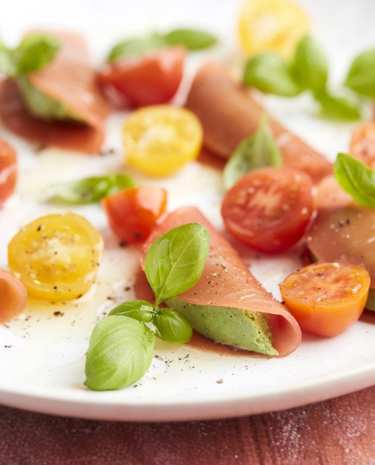Een fijnzinnig voorgerechtje om mee te scoren op een feestelijk diner! De ‘pasta’-velletjes die we opvullen met basilicummousse en toeklappen tot halve maantjes zijn gemaakt van tomatensap.