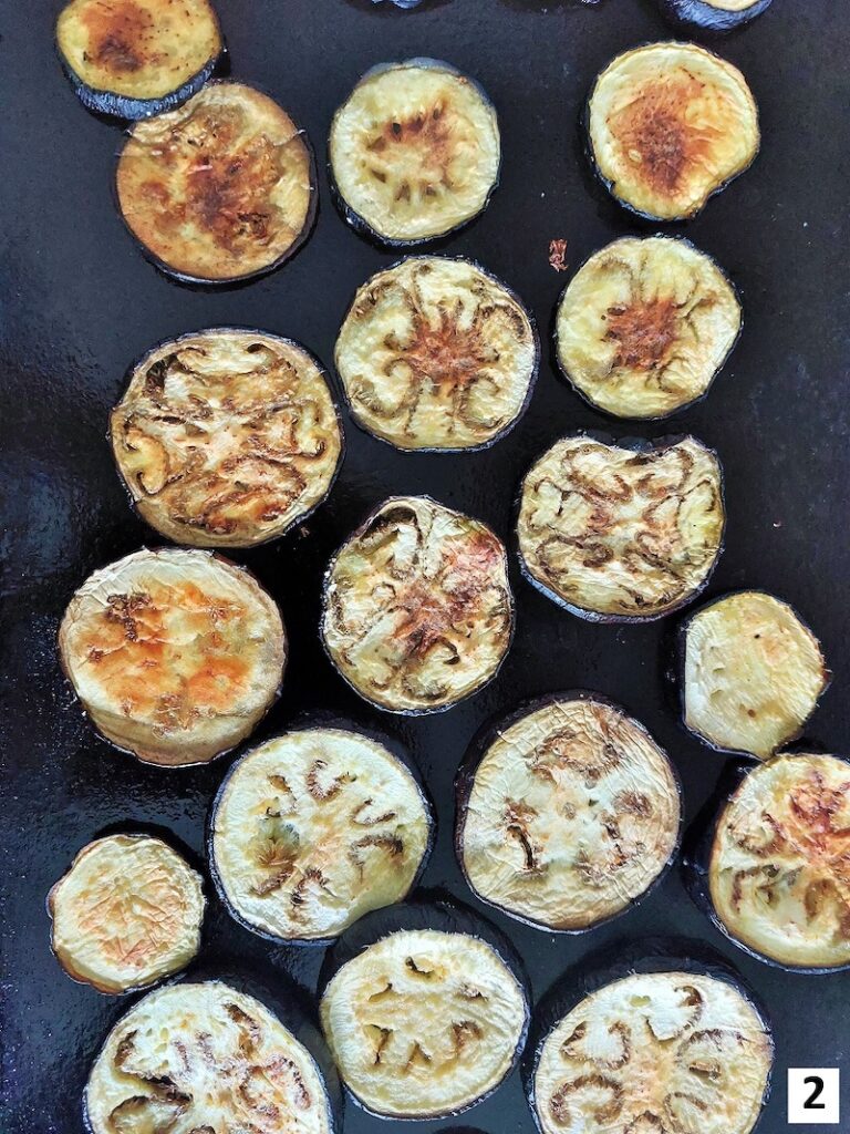 1. Snijd de aubergine in plakken van maximaal 1 cm (een mandoline is handig om gelijkmatige plakken snijden). Als je tijd hebt, strooi dan wat zout over de plakken en laat 1 uur rusten. Hiermee ontdoe je ze van het bittere vocht. Dep na een uur droog en schoon met keukenpapier.