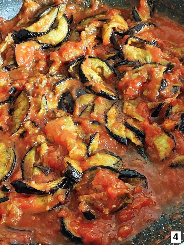 3. Snijd ondertussen de aubergine in repen (3) en voeg toe aan de saus (4). Scheur de basilicumblaadjes en voeg deze ook toe aan de saus.