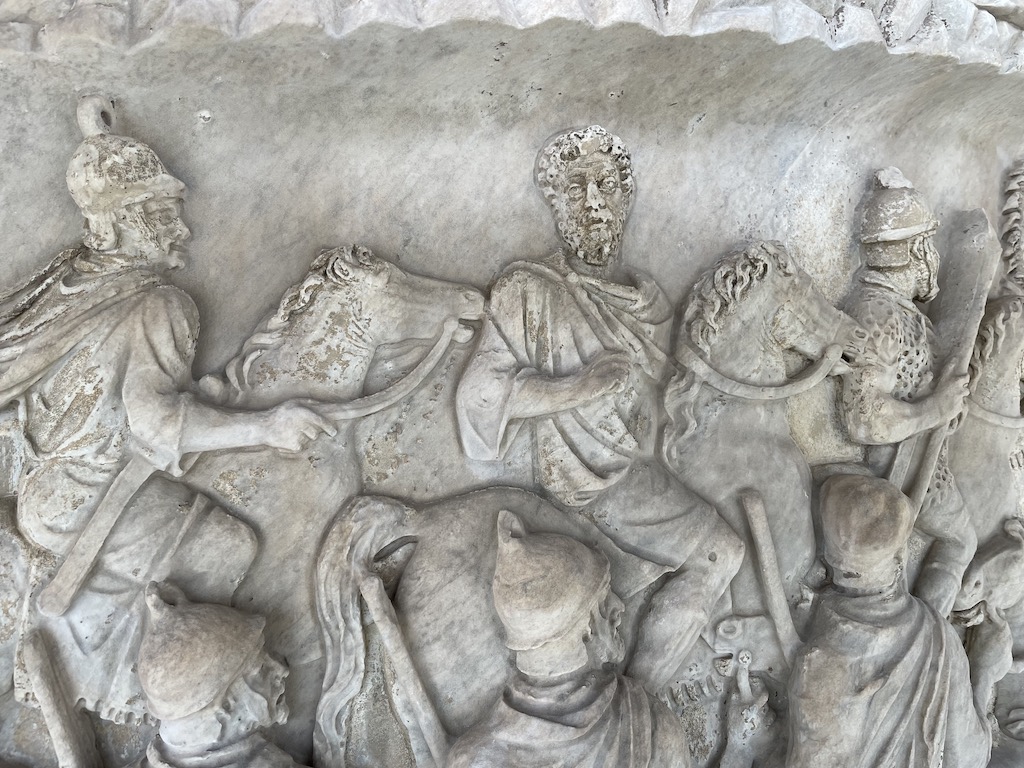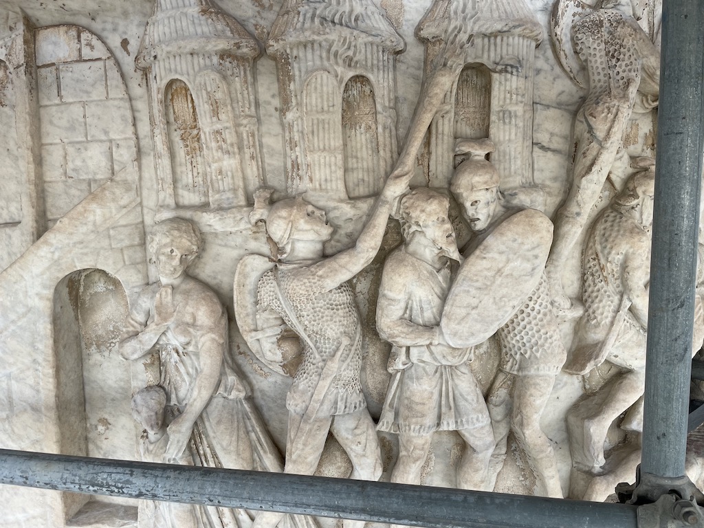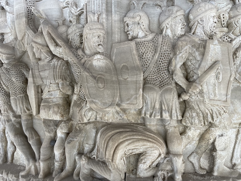 Dat mag je inderdaad wel zeggen. De reliëfs zijn een opeenvolging van alledaagse oorlogstaferelen: een vrouw wordt door een soldaat aan haar haren meegetrokken; een knielende barbaar wordt gespiest; een beteuterd kijkende moeder en kind als oorlogsbuit op de ossenwagen afgevoerd; vluchtende tegenstanders gedood; een dorp in brand gestoken; een kar volgeladen met wapens en schilden van gesneuvelde krijgers. De zuil, die bedoeld was als een monument van de grootsheid van Rome, is daarmee ook een – maar al te actuele – aanklacht tegen de gruwelen van de oorlog.