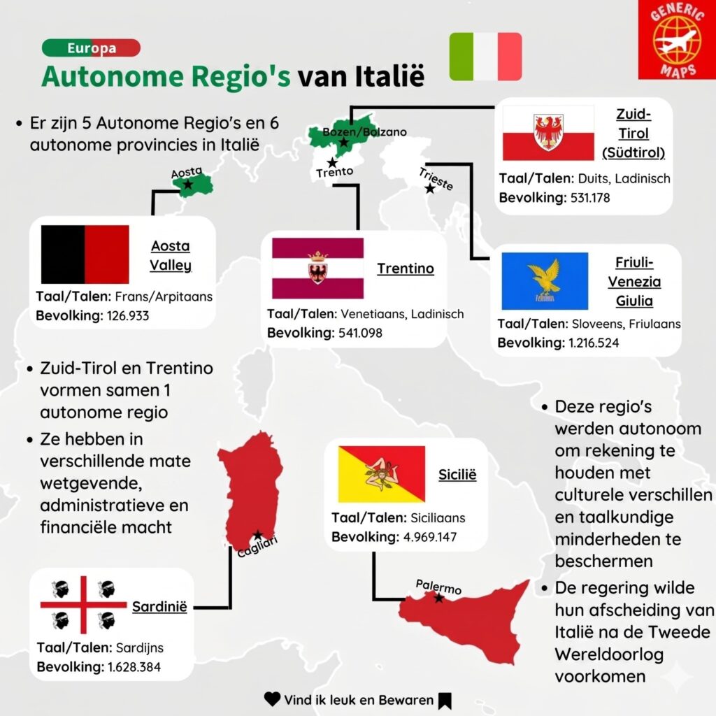 Italië is verdeeld in 20 gebieden, regio’s of gewesten. Regioni in het Italiaans. Elke regio heeft een overheid en een parlement. 5 van de regio’s, namelijk: Sicilië, Sardinië, Valle d’Aosta, Trentino-Zuid-Tirol en Friuli-Venezia-Giulia, hebben een autonome status. Dat houdt in dat deze regio’s afhankelijk zijn en geen volledige politieke onafhankelijkheid of soevereiniteit hebben. Ze hebben echter wel meer zeggenschap over de invulling van de politiek en ze heffen hun eigen belastingen.