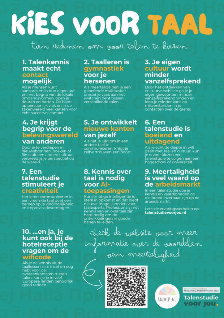 Ik zag deze week 10 redenen op een poster van Taalwijs om een taal te studeren. Stuk voor stuk goede redenen.