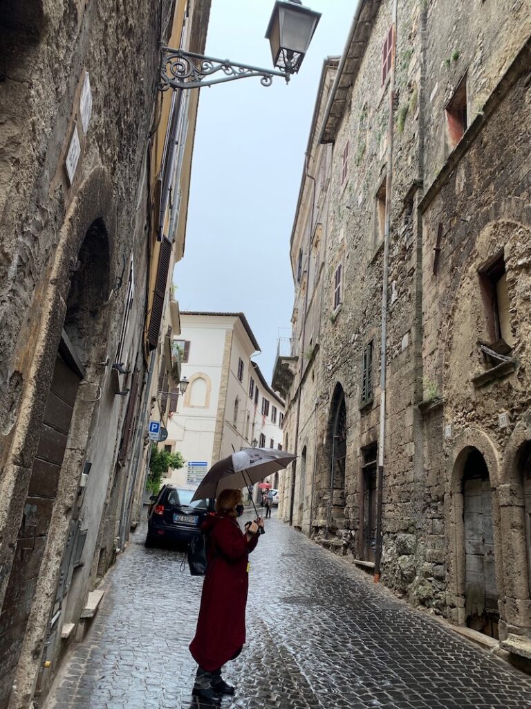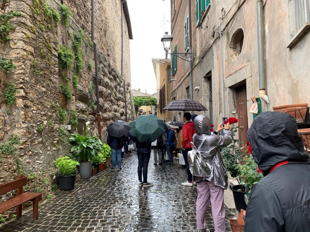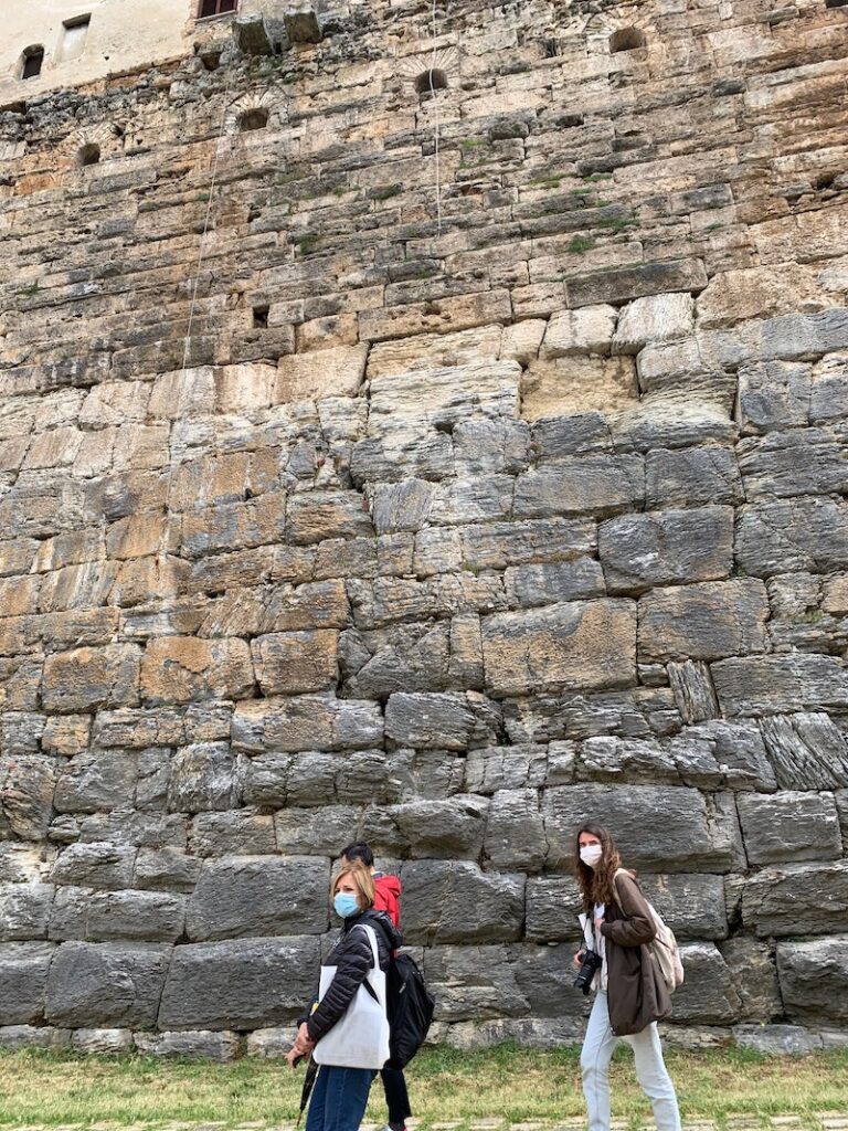 Na een ontvangst en een door regen en covid-maatregelen wat chaotische accreditatie in een tent voor de stadsmuur, werden we door de archaïsch-Romeinse Porta Montana de smalle straatjes van het oude centrum in geleid, op weg naar de antieke Romeinse overdekte markt.